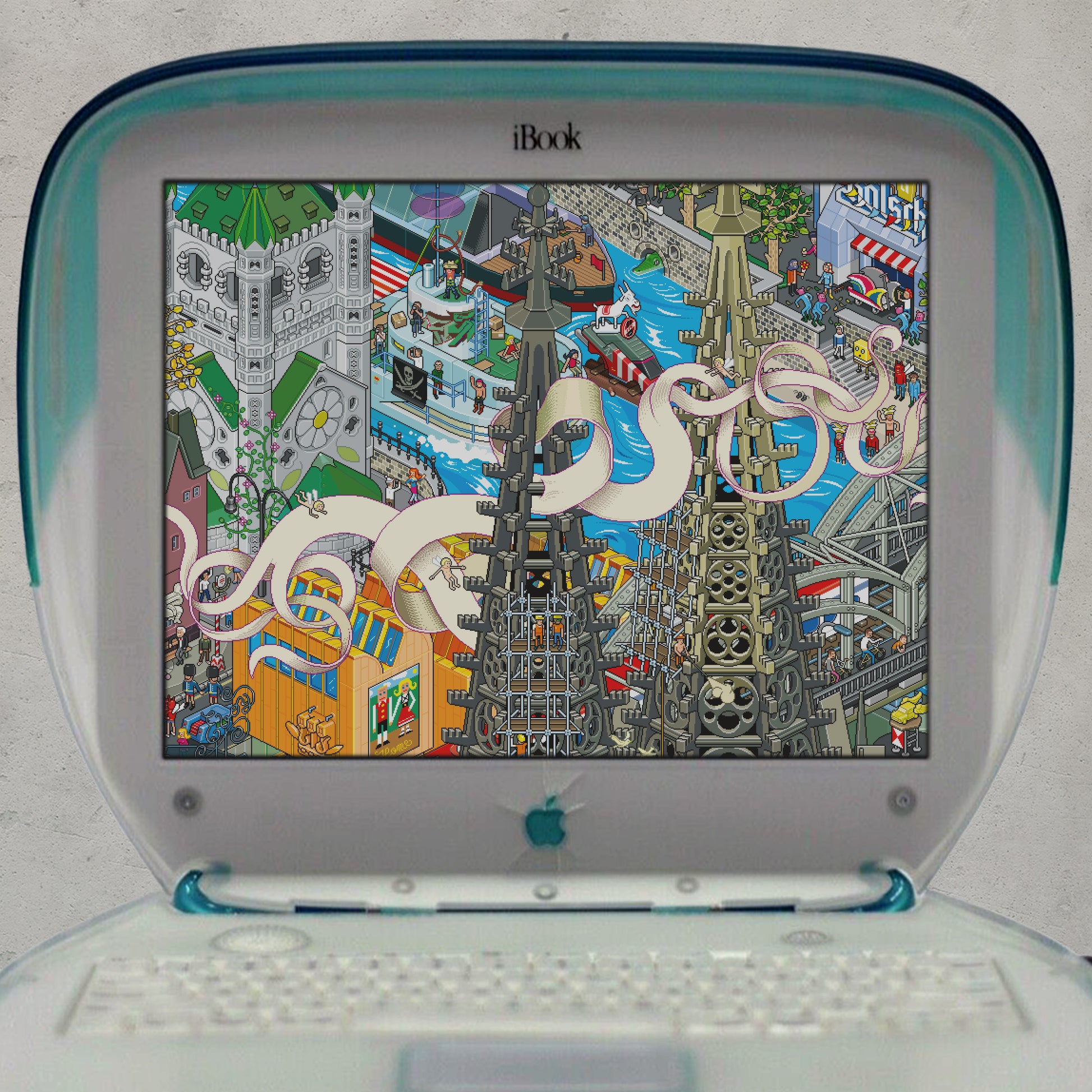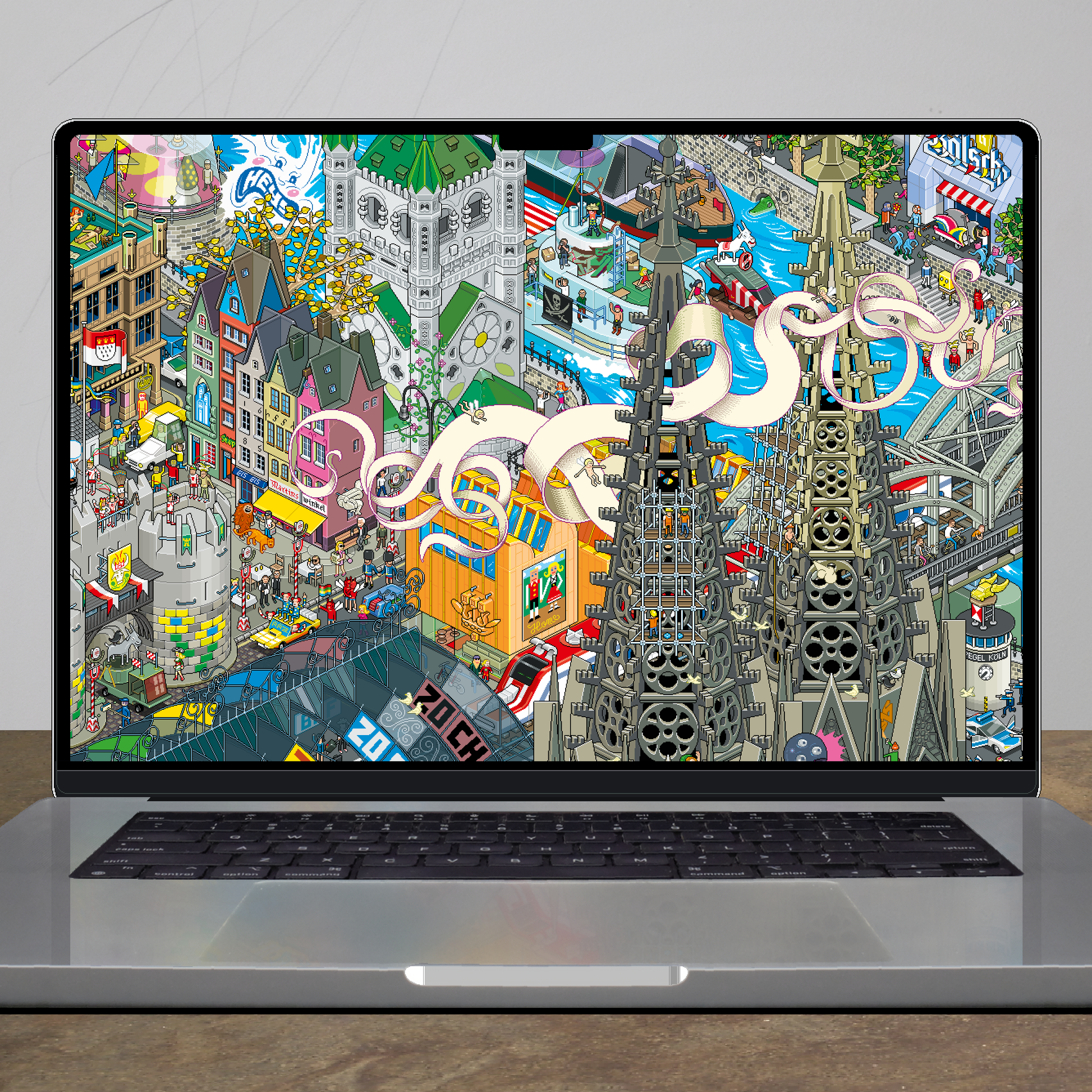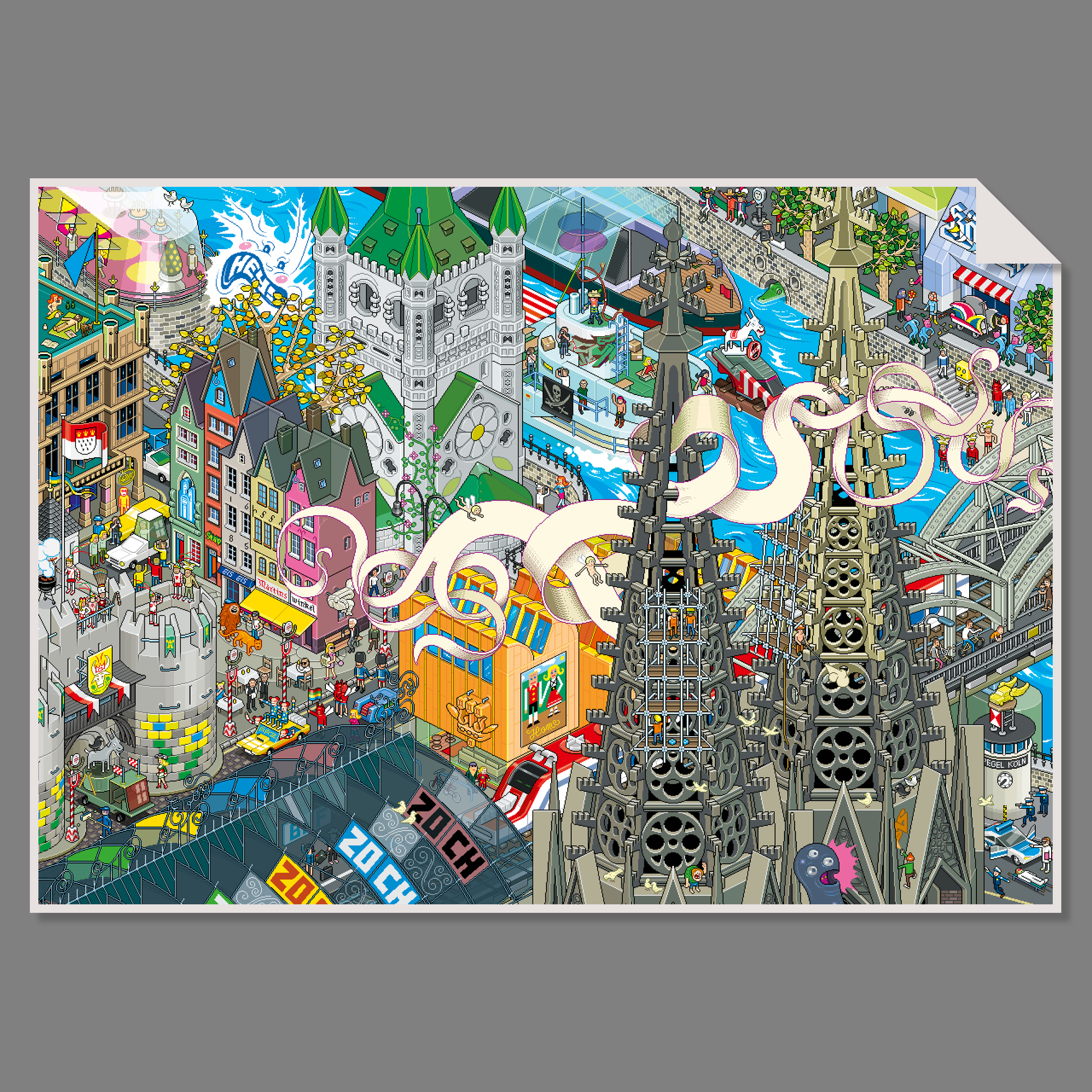 Digital pixel art wallpaper, featuring the city of Cologne Pixorama by eBoy.