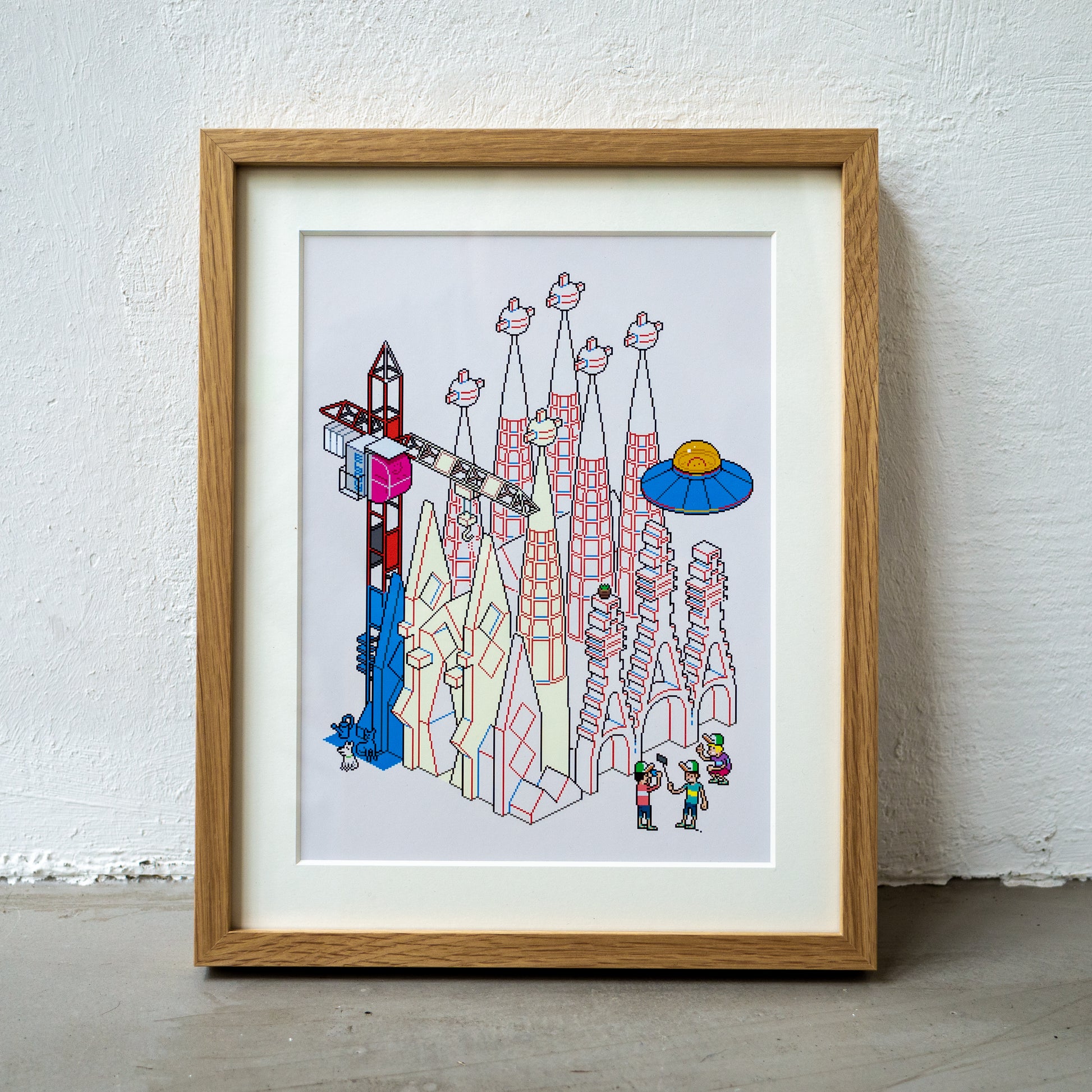 Framed pixel art print by eBoy, featuring the unfinished church of Sagrada Familia in Barcelona.